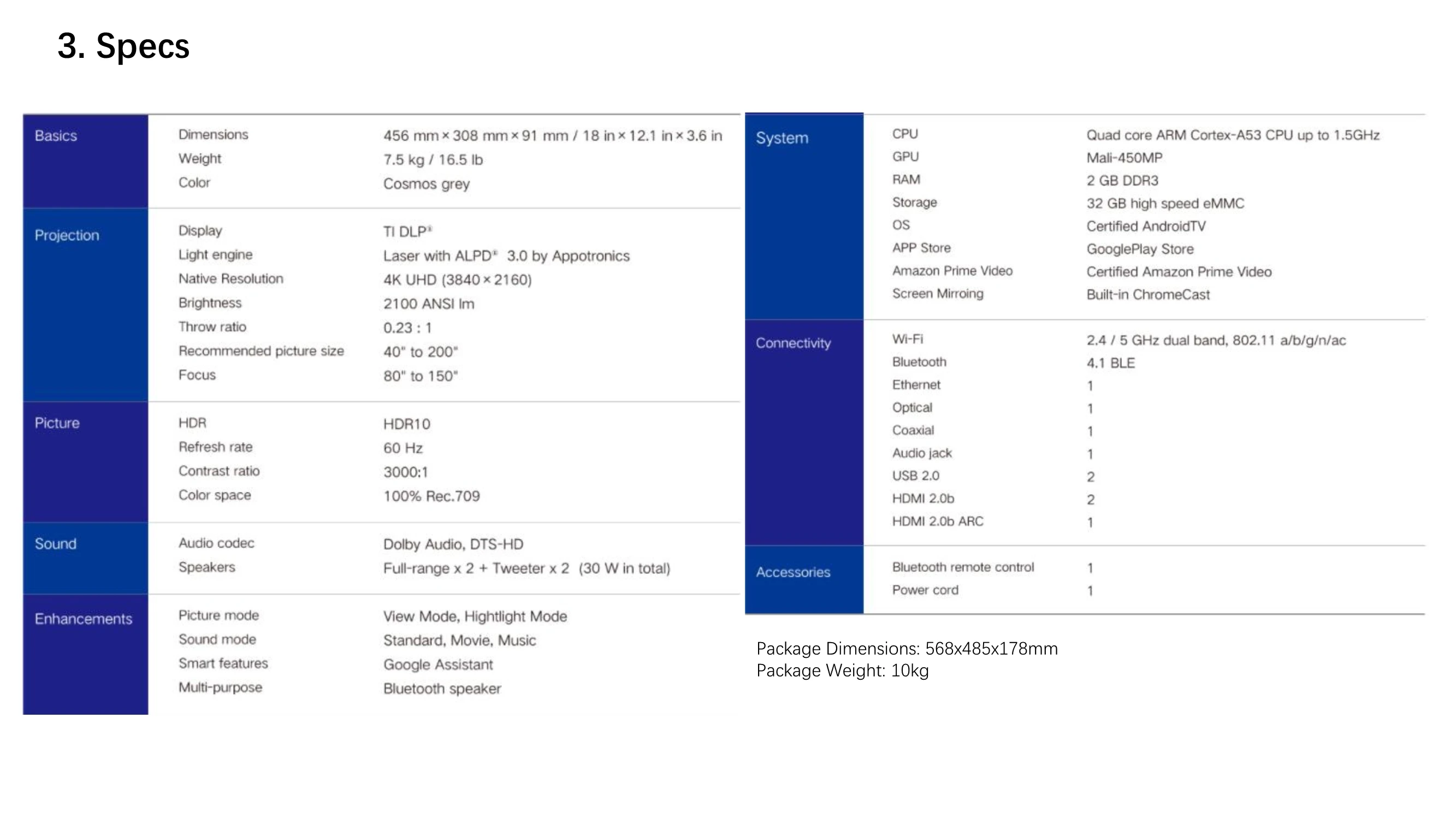• Tỷ lệ tương phản 3000:1, với HDR10 chi tiết tối cho hình ảnh rõ ràng, sống động hơn