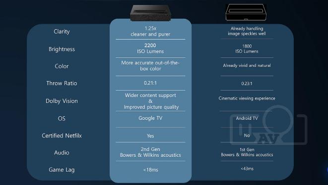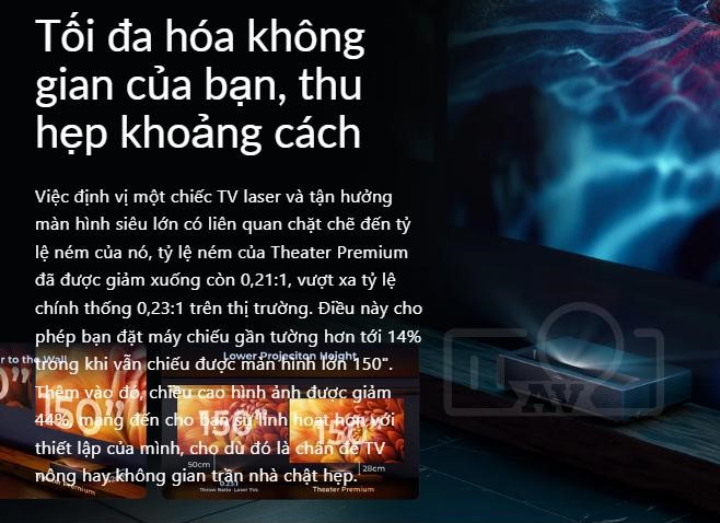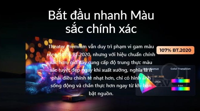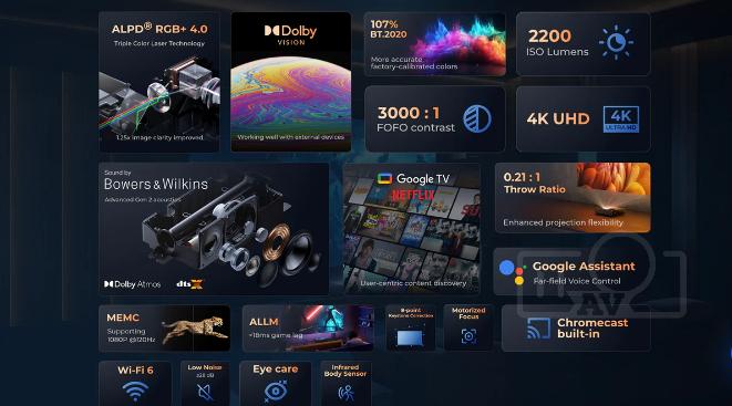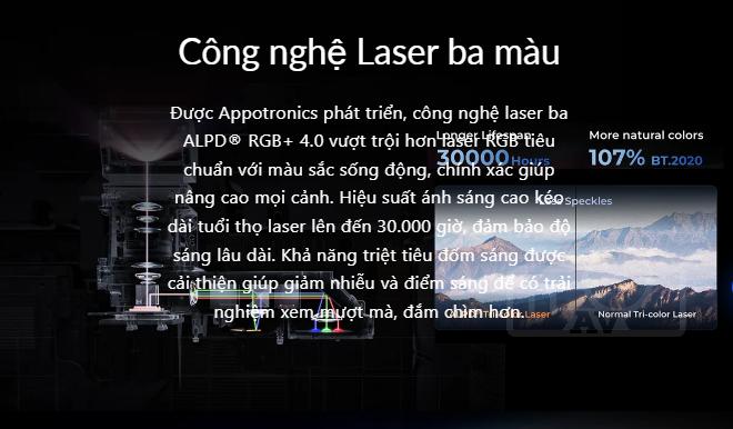- Công nghệ hình ảnh: Sử dụng công nghệ ALPD® 4.0 RGB+ tiên tiến, mang đến hình ảnh sống động và chân thực. Độ phân giải 4K UHD sắc nét, độ sáng 1800 ISO lumens đủ để chiếu phim trong điều kiện ánh sáng phòng vừa phải. Gam màu rộng 107% Rec.2020 đảm bảo màu sắc chính xác.