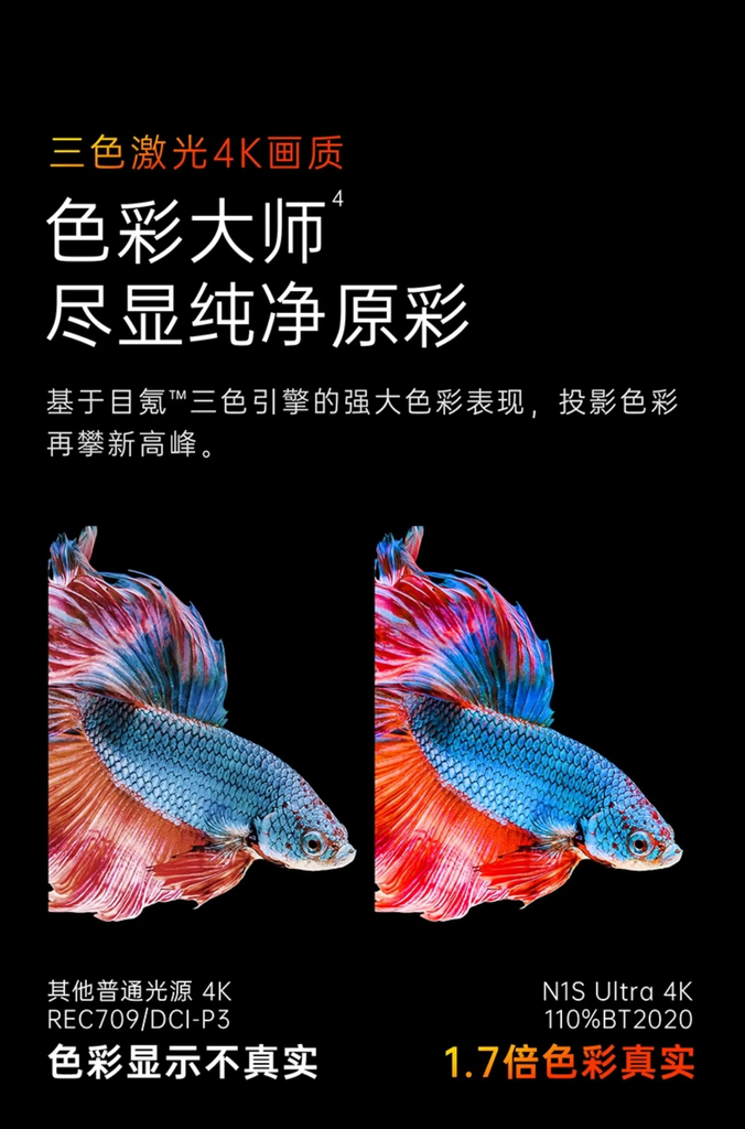 Với sự thành công của máy chiếu N1 Ultra 4K, hãng JMGO mới đây giới thiệu sản phẩm mới nâng cấp hơn là máy chiếu JMGO N1S Ultra 4K với độ sáng lên đến 3000 CVIA lumen tương đương 4500 ansi lumen, cho khả năng chiếu màn hình lớn hơn ở phòng sáng không cần kéo rèm. N1S Ultra 4K vẫn sử dụng công nghệ laser 3 màu cao cấp cho hình ảnh sáng rõ, sắc nét, màu sắc tươi sáng, và nâng cấp cải thiện chống đốm hiệu quả hơn phiên bản cũ